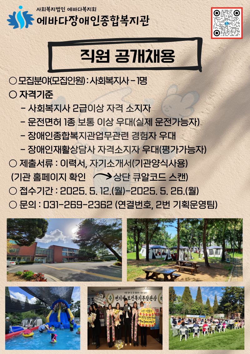Á¦¸ñ: ¿¡¹Ù´ÙÀå¾ÖÀÎÁ¾ÇÕº¹Áö°ü Á÷¿ø °ø°³Ã¤¿ë(»çȸº¹Áö»ç) ½Ç½Ã