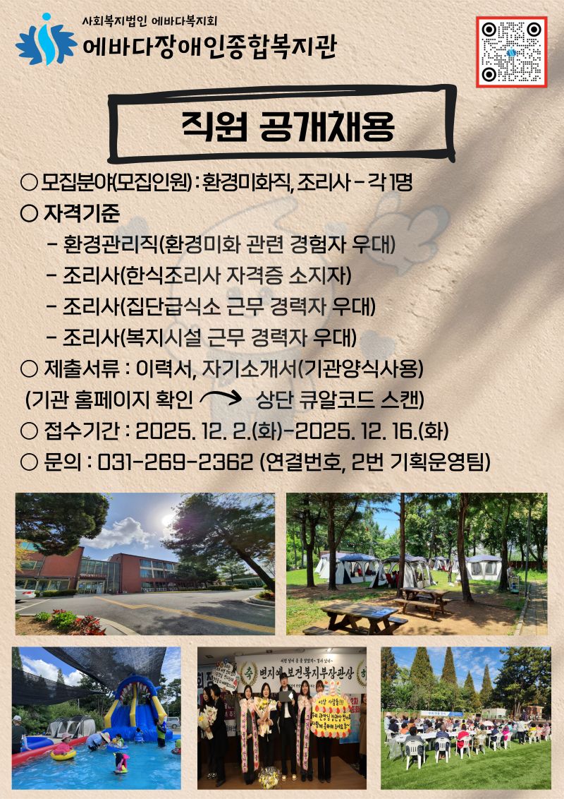 Á¦¸ñ: ¿¡¹Ù´ÙÀå¾ÖÀÎÁ¾ÇÕº¹Áö°ü Á÷¿ø °ø°³Ã¤¿ë(ȯ°æ¹ÌÈÁ÷, Á¶¸®»ç) ½Ç½Ã