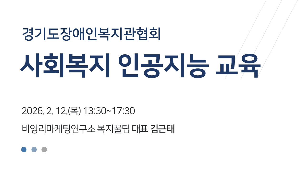 °æ±âµµÀå¾ÖÀκ¹Áö°üÇùȸ´Â ÃÖ±Ù Àå¾ÖÀκ¹Áö°ü Á¾»çÀÚ¸¦ ´ë»óÀ¸·Î ÇÑ ¡®Àå¾ÖÀκ¹Áö°ü AI Á÷¿ø±³À°¡¯À» ÁøÇàÇß´Ù. À̹ø ±³À°Àº ±è±ÙÅ °»ç(ºñ¿µ¸®¸¶ÄÉÆÃ¿¬±¸¼Ò º¹Áö²ÜÆÁ ´ëÇ¥)°¡ °ÀǸ¦ ¸Ã¾Æ ÀΰøÁö´ÉÀ» Ȱ¿ëÇÑ ¹®Àå ÀÛ¼º, º¸°í¼ Á¤¸®, À̹ÌÁö¡¤Æ÷½ºÅÍ Á¦ÀÛ, PPT ¹× ¿µ»ó Á¦ÀÛ µî ½Ç¹« Á᫐ ³»¿ëÀ¸·Î ±¸¼ºµÆ´Ù.